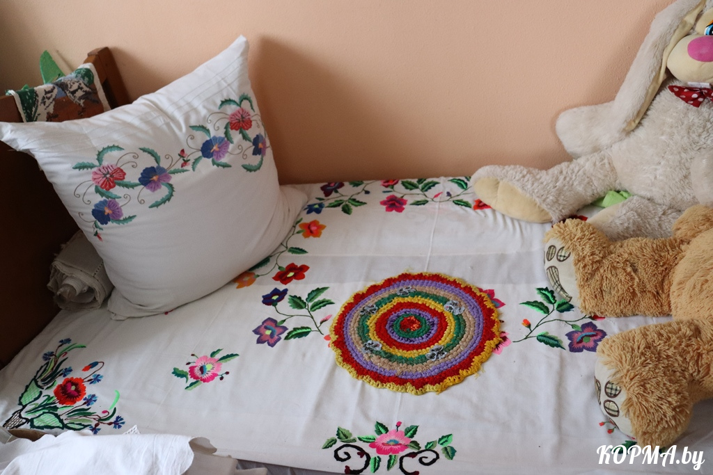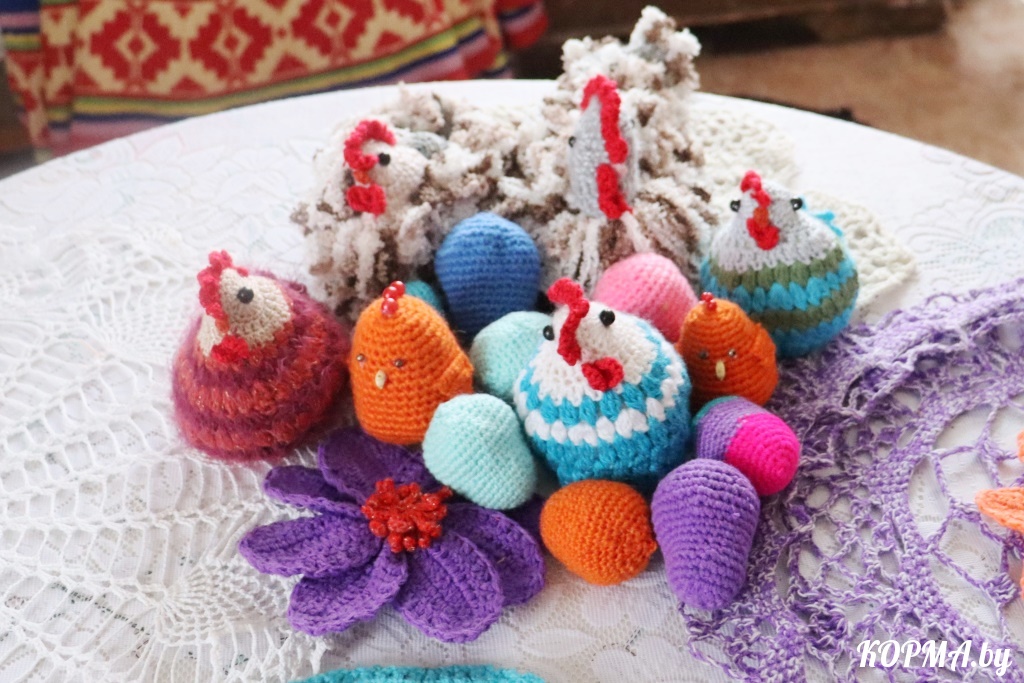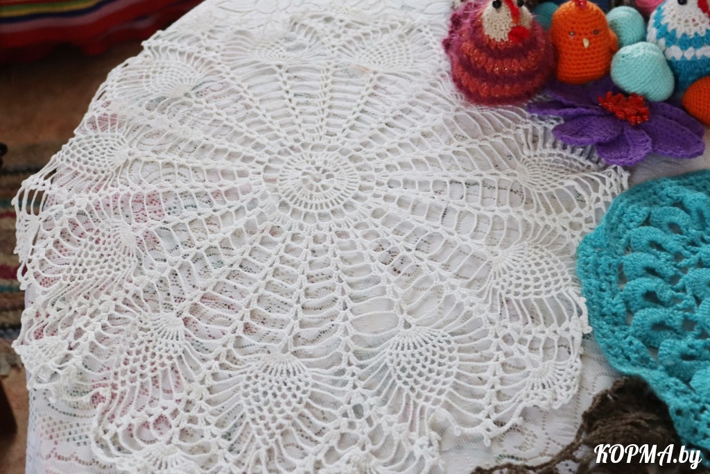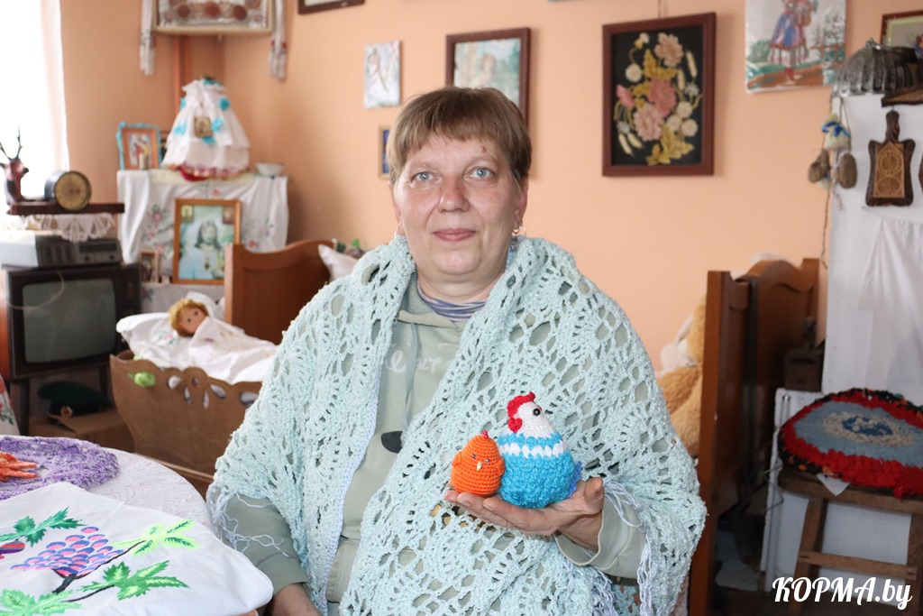 Многие работы Елены Павловны и её талантливой бабушки хранятся в Барсуковском сельском доме народных традиций. Здесь общаемся не только с самой рукодельницей, но и с заведующей учреждением культуры Татьяной Новиковой, которая провела небольшую экскурсию, рассказав, кем и какие экспонаты созданы. Например, покрывало вышила Анна Борисовна, а свадебный рушник – Елена Павловна. Она же связала различные салфетки, у каждой из которых свой уникальный узор. К Пасхе презентовала вязаное семейство курочек с цыплятами и другие изделия.
