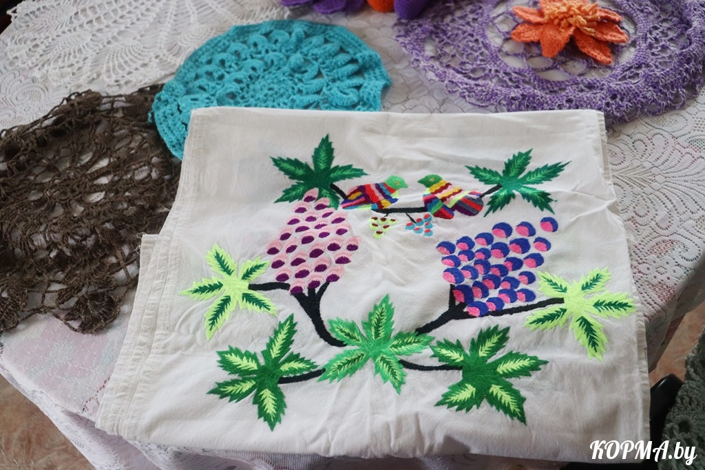 Нить в её умелых руках превращается в настоящее волшебство. На белоснежное полотно ложатся ровные строчки, сплетающиеся в прекрасные узоры – птиц, цветы, виноградную лозу и многое другое.