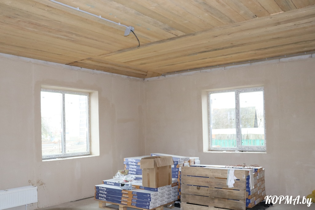 Сейчас многие строительные работы остались уже позади. Возведены стены, сделана крыша, поставлены окна и входные двери, отдельные помещения оштукатурены, подведены коммуникации. Буквально на днях был приобретён и установлен твердотопливный котёл. Сейчас продолжает прокладываться проводка.