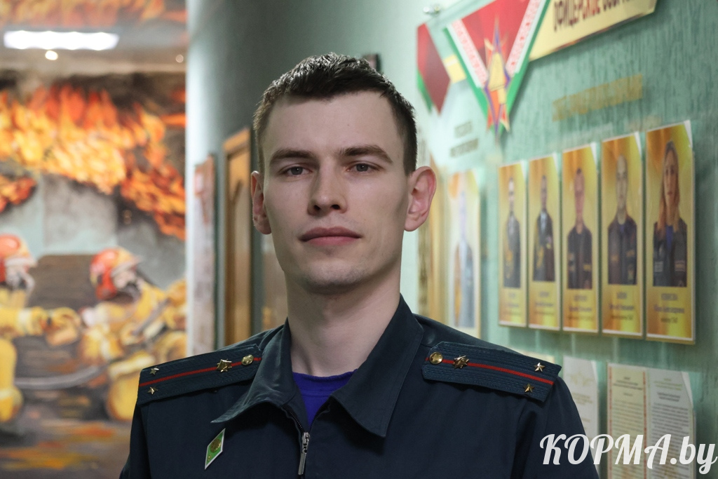 Только несколько месяцев назад Дмитрий Титовец переехал на Кормянщину из Речицы. Всю свою трудовую деятельность посвятил работе в органах по чрезвычайным ситуациям. Закончив школу, по совету родителей поступил в Гомельское высшее командно-инженерное училище МЧС Республики Беларусь и ни разу об этом не пожалел. Причём он продолжил династию службы в органах, которую когда‑то начинал его дед. На вопрос о том, какой случай из профессиональной деятельности стал самым запоминающимся, Дмитрий Александрович припомнил один из них. Выехав на разбор завалов после пожара дома, где полностью сгорела крыша, находились с товарищем как раз в том самом месте, где стояла печная труба. В какой‑то момент это строение начало наклоняться. Интуитивно Дмитрий оттолкнул коллегу, буквально сбив его с ног, отскочил и сам. Таким образом, они оба не пострадали.