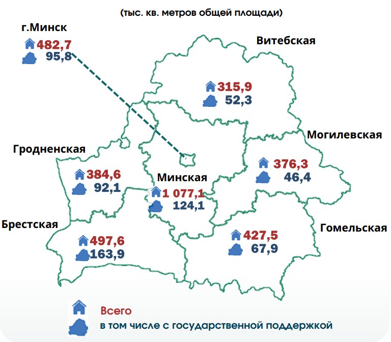 Яркий тренд — активное развитие сельских территорий. На село приходится 38,8% всего введенного жилья — 1,38 миллиона квадратных метров. Это стратегический курс на оживление деревень, создание современных условий жизни вне крупных городов. Новые дома, инфраструктура и рабочие места меняют облик белорусской глубинки.