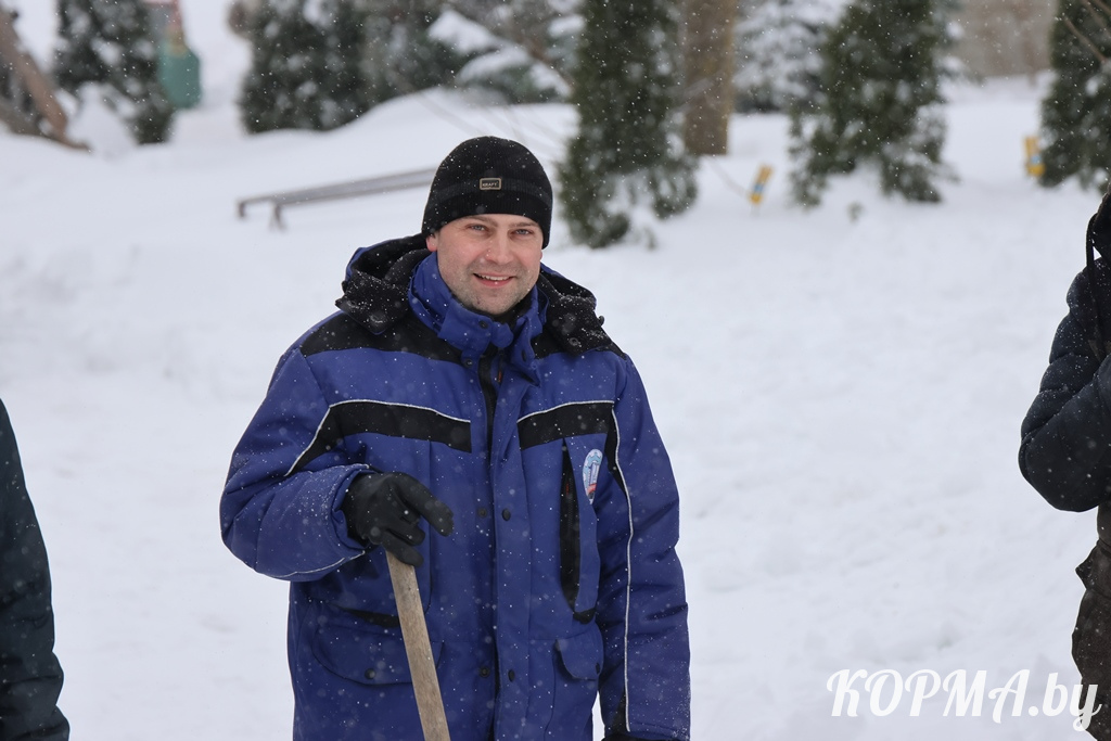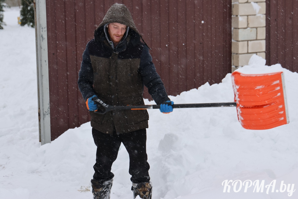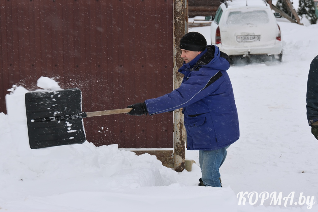 Вот и на борьбу со снежной стихией вышли сообща. Так и дело быстрее идёт, и усадьба становится краше. В помощь им хорошее настроение и весёлые шутки.