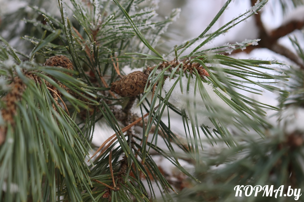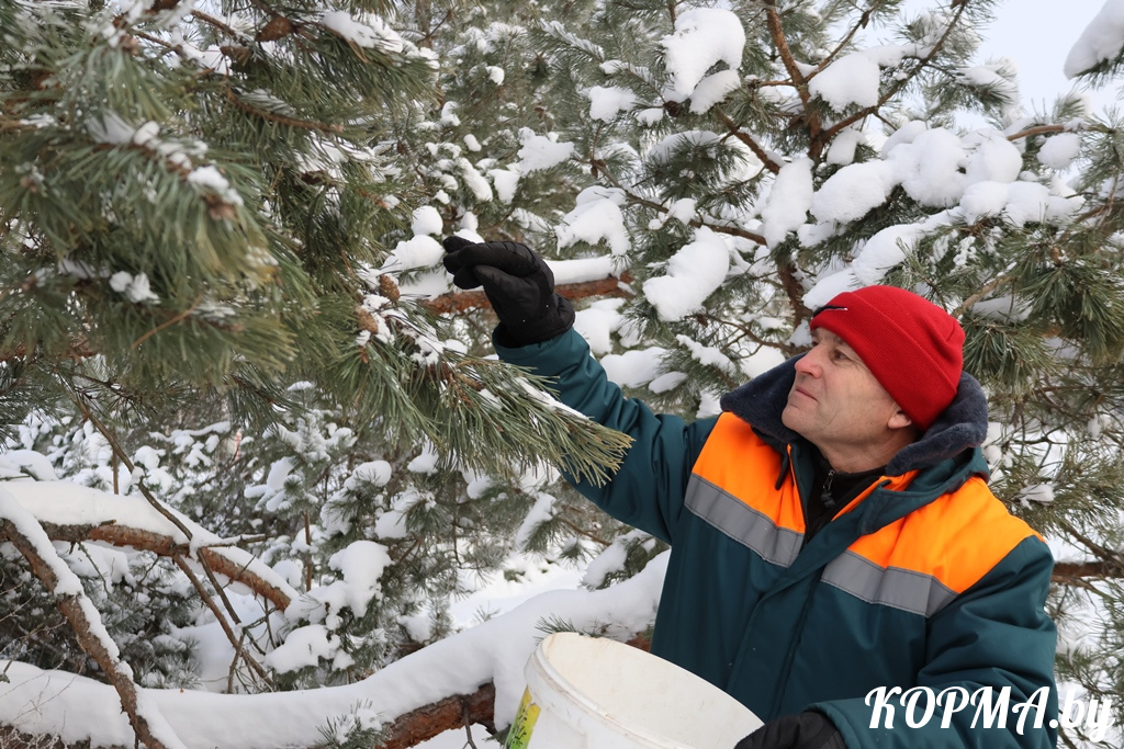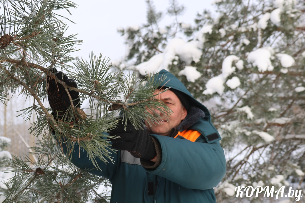 В таких разговорах дорога проходит незаметно, и мы прибываем в лесной квартал возле деревни Волынцы, где проходит сбор шишек. Эту работу в день визита журналистов выполняли лесоводы Василий Ходанович и Михаил Славинский. Отряхнув сосновые ветви от снега, специалисты осматривают их и собирают урожай.