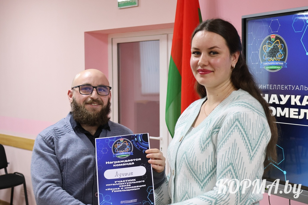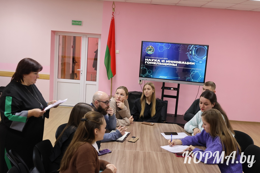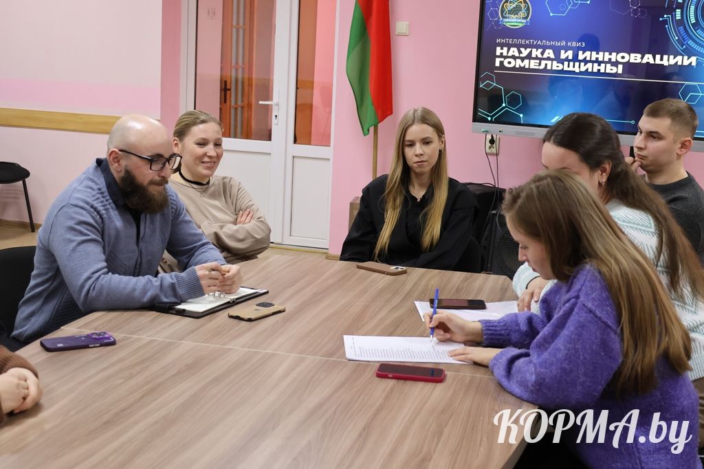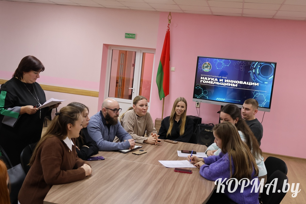 Следующей частью встречи стало проведение интеллектуального квиза «Наука и инновации Гомельщины». Разделившись на две команды, представители молодёжи приняли участие в познавательной викторине, вопросы которой были связаны с историческими сведениями и развитием Гомельской области. Участники соревновались в пяти турах, активно отвечали на вопросы и обменивались знаниями и интересными сведениями о родной земле.