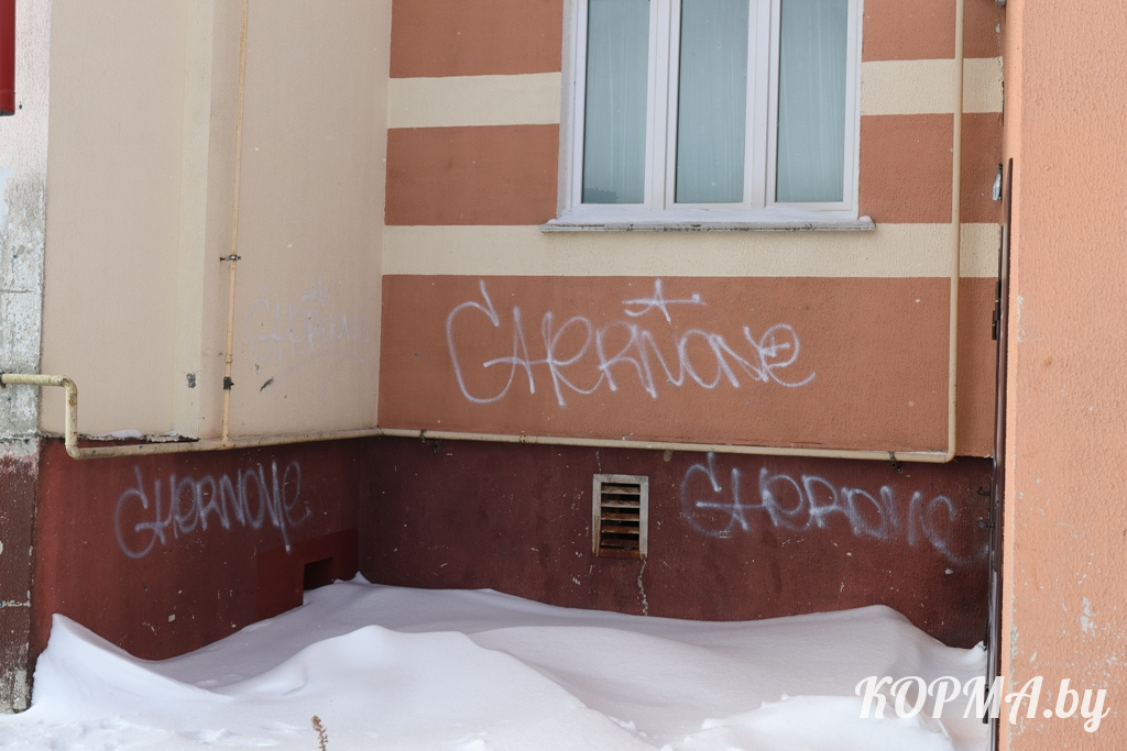 Стены дома № 39А по улице Ленина в г. п. Корма исписаны сомнительными граффити, которые превращают жилое здание в неприглядный объект.