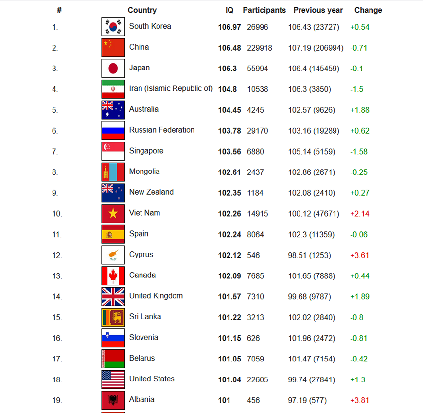 Лидером мирового рейтинга стала Республика Корея (106,97), на втором месте расположился Китай (106,48), замыкает тройку Япония (106,3). В пятерке оказались также жители Ирана (104,8) и Австралии (104,45), на шестой позиции расположилась Россия (103,78).