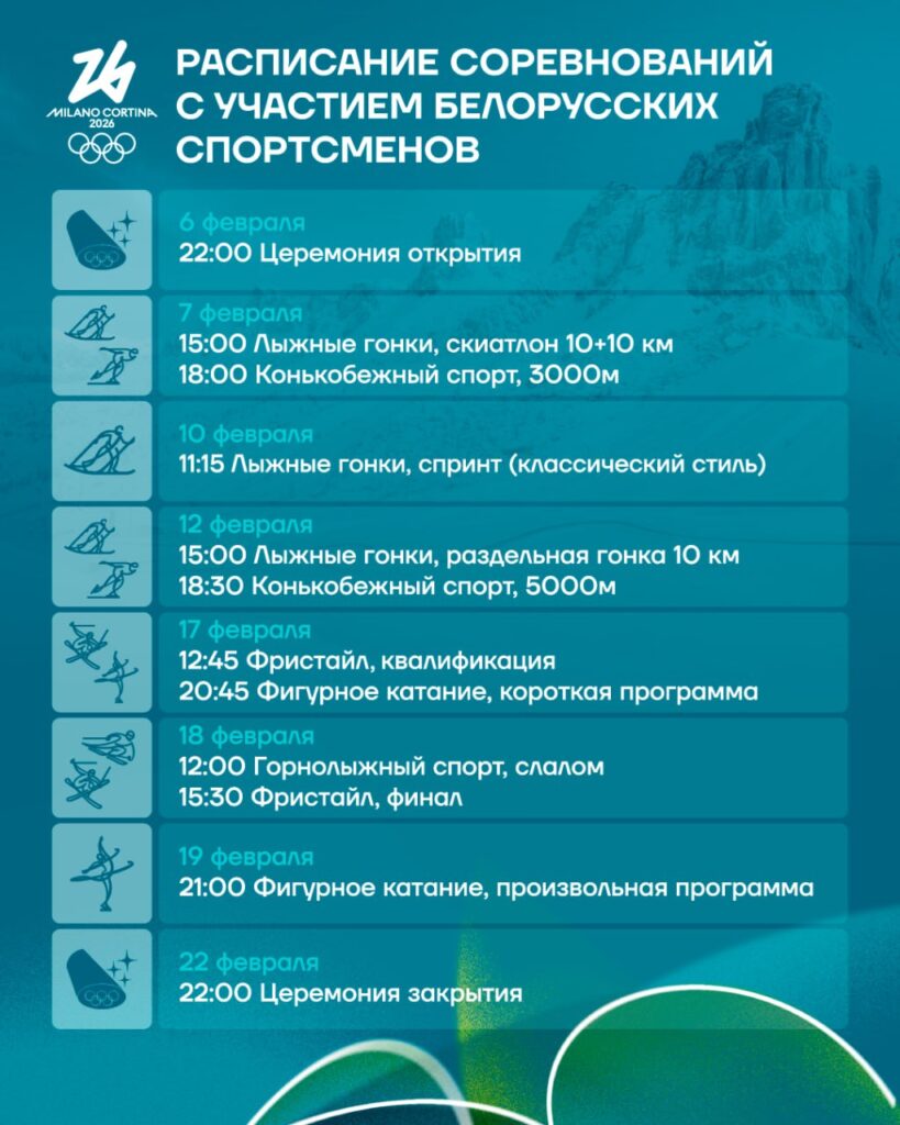 Белорусские спортсмены в субботу, 7 февраля, начинают выступления на зимних Олимпийских играх 2026 года в итальянских Милане и Кортина-д’Ампеццо.